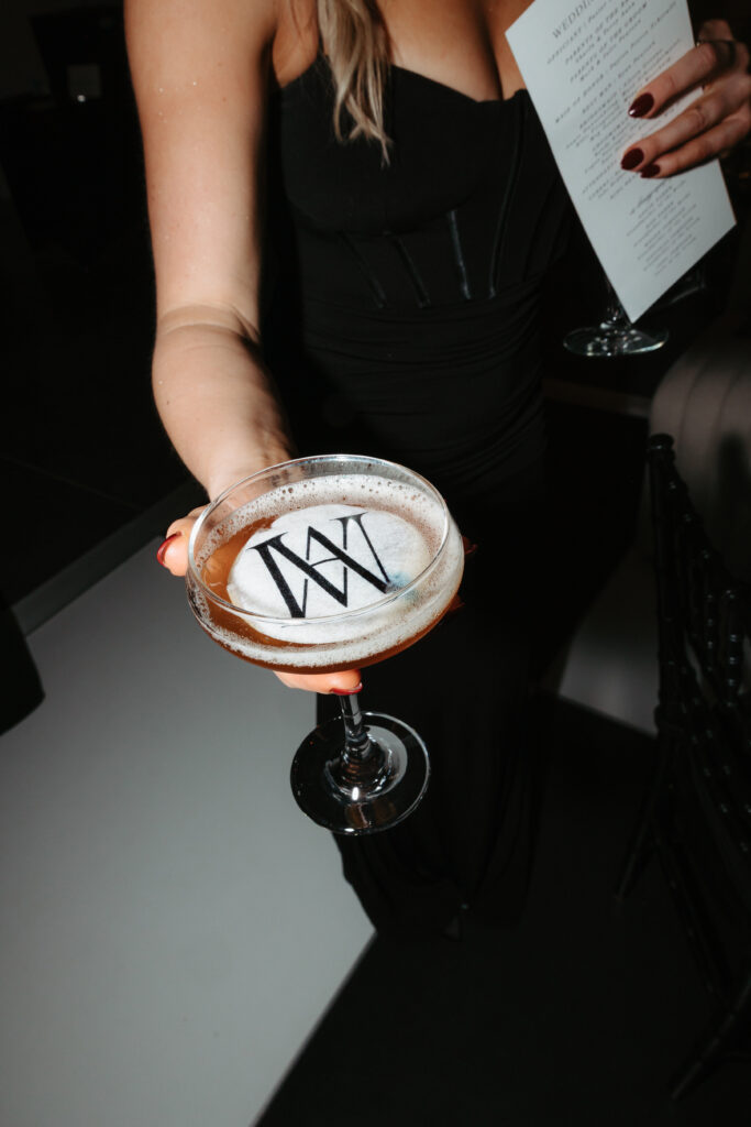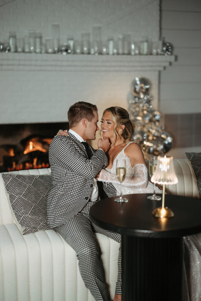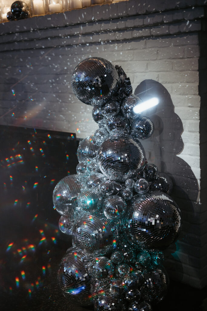 Our Fireside Room offered the perfect backdrop for a cozy cocktail hour lounge, and later, a packed dance floor, framed by a glittering disco ball installation. Everything from the lush florals and velvet linens, to the disco ball accents and twinkling candlelight, the custom espresso martinis, and even the bride’s sparkling second look, felt modern, festive and glamourous – the perfect combination for a New Year’s Eve wedding celebration.