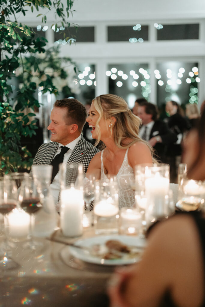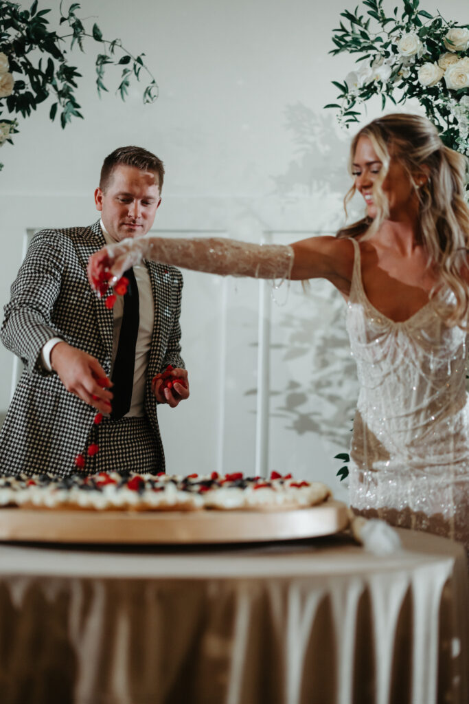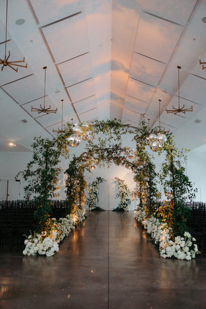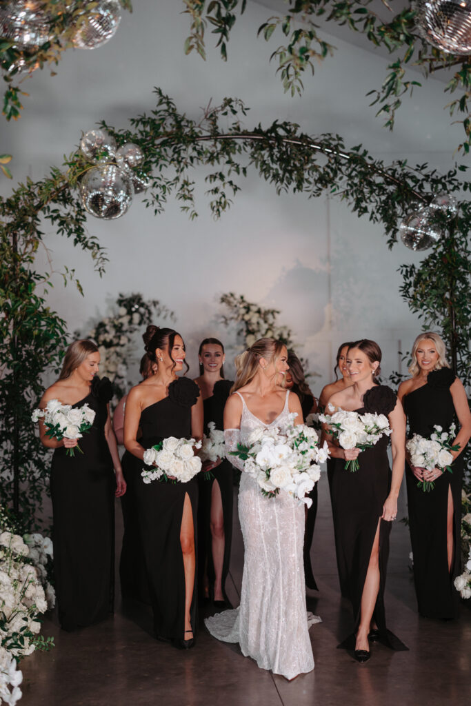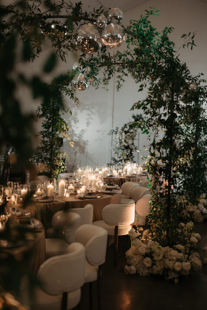 Alisha, Matt and their wedding party dressed for the occasion – the bride chic and sparkling in a stunning Berta gown, groom in a modern houndstooth suit, and wedding party in formal black. The couple hosted their ceremony in our Lakeside Room. Arches adorned with greenery and shimmering disco balls created a stunning aisle. The space was later transformed for their reception dinner, featuring a dramatic serpentine table down the center of the room that glowed with romantic candlelight.